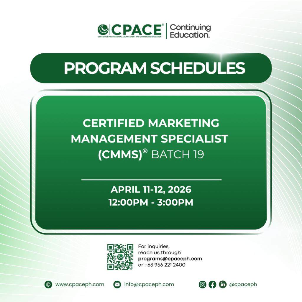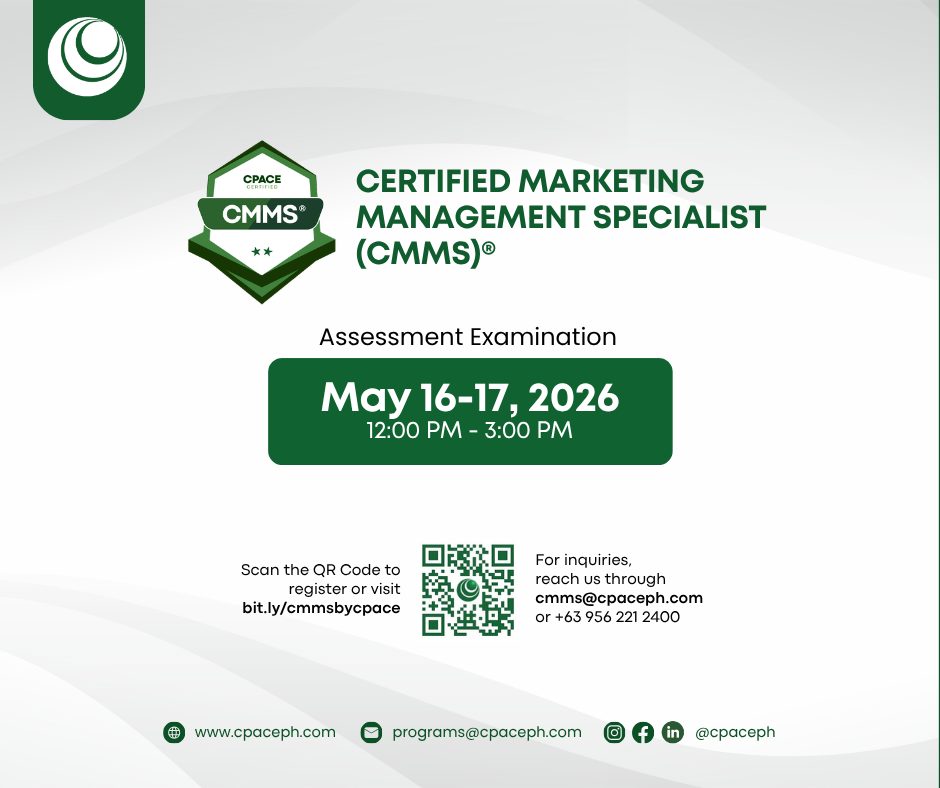 The CERTIFIED MARKETING MANAGEMENT SPECIALIST (CMMS)® is an assessment examination of the basic knowledge in the field of marketing management by the Center for Professional Advancement and Continuing Education, Inc. (CPACE Philippines). The examination is designed to assess the fundamental knowledge that an aspiring or practicing marketing professional must possess.