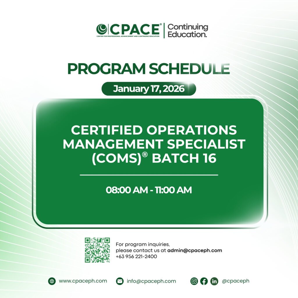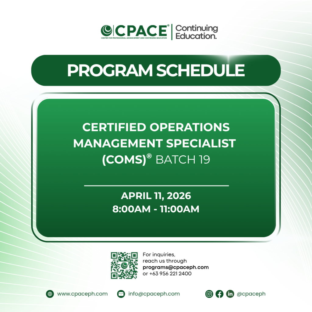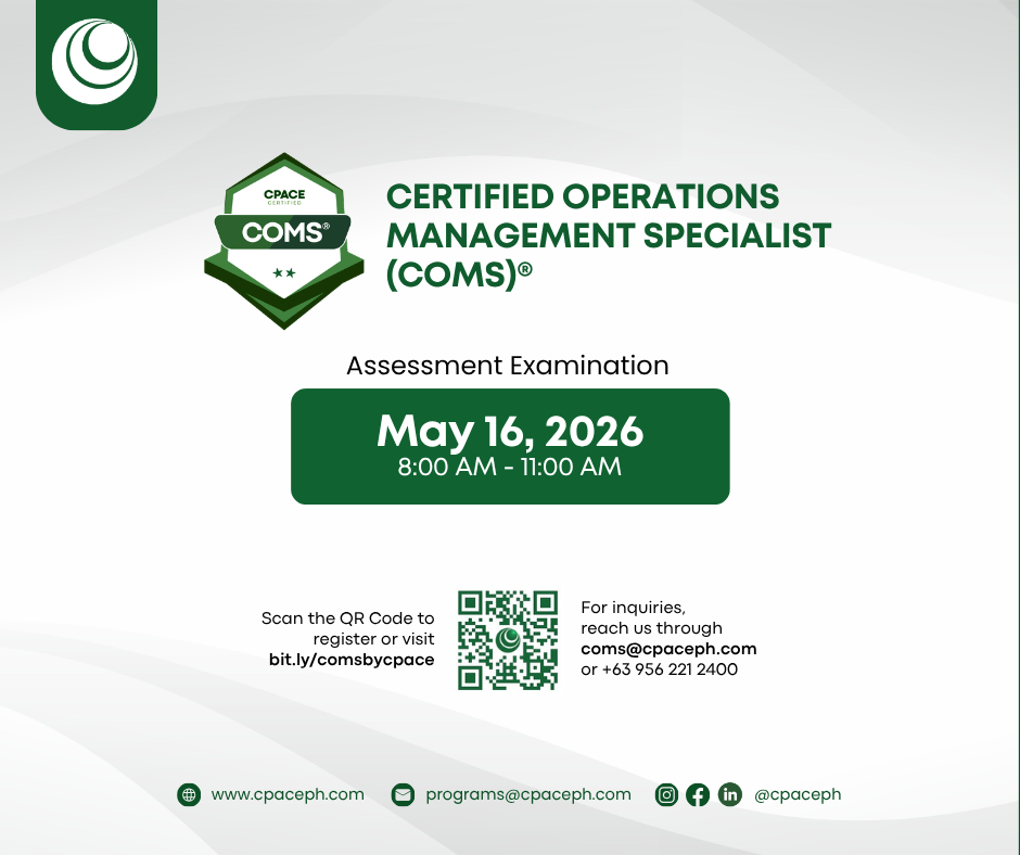 The CERTIFIED OPERATIONS MANAGEMENT SPECIALIST (COMS)® is an assessment examination of the basic knowledge in the field of marketing management by the Center for Professional Advancement and Continuing Education, Inc. (CPACE Philippines). The examination is designed to assess the fundamental knowledge that an aspiring or practicing marketing professional must possess.